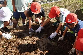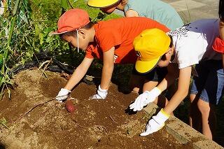 今日は2年生が生活科の学習で春に植えたサツマイモの収穫をしました。