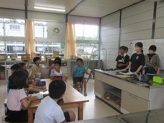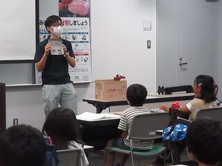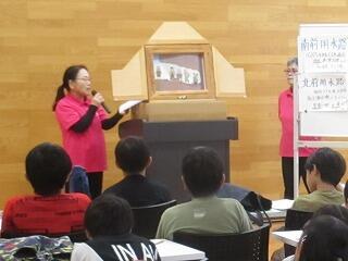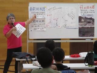 マイクロバス2台で乙房小から庄内地区公民館に移動し、「関之尾むかえびとの会」の皆様が、関之尾を水源とする3本の用水路の説明や、前田用水路の開発に尽くした坂元源兵衛さんの紙芝居を見せてくださいました。