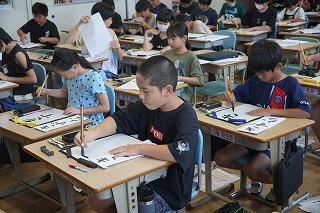 5年生が書写(毛筆)の学習をしていました。めあては、「点画のつながりに気をつけて、ひらがな三文字を書こう」です。