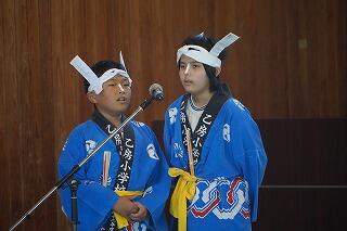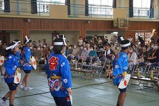 本校からは、この敬老まつりのお祝いとして、1年生3名と4年生1名が、おじいちゃん、おばあちゃんに向けての作文発表を、5・6年生の子どもたちが乙房奴踊りの披露を行いました。