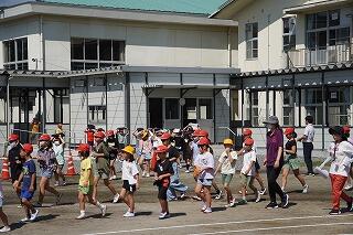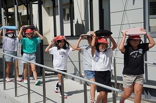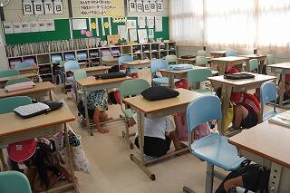 現在の仮設校舎に引っ越してから、初めての地震対応の避難でしたが、先生の指示に従い、みんな真剣に取り組むことができました。今日の避難訓練にかかった時間は3分21秒でした。事前に担任の先生から指導があった「おはしも」をしっかりと守って避難できました。
