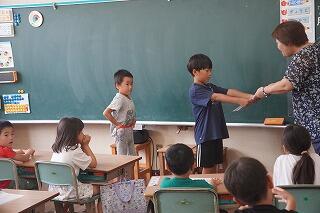 子どもたちは、各学級で担任の先生から通知表「あゆみ」を笑顔で受け取りました。「夏休みに家族でどこかに出かけたいです」、「プールに行きます」「バーベキューをします」「キャンプをします」「映画を見に行きます」「おじいちゃん、おばあちゃん家に行きます」と、とても楽しみにしている様子でした。