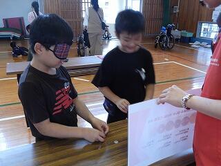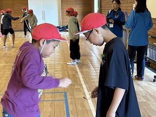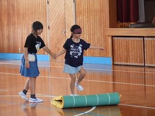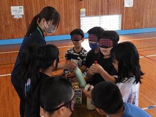 アイマスク体験ではいつも何気なく歩いている学校を、アイマスクをして歩いてみるという体験をしました。