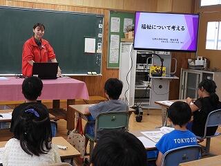 はじめに、「『福祉』って何だろう?」ということをみんなで考えたり、お話を聞いたりしました。(ふ)…ふだんの、(く)…くらしの、(し)・・・しあわせ