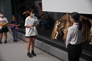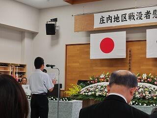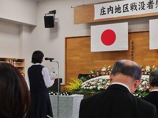 慰霊祭の中で庄内中学校の生徒会の2名が平和へのメッセージを朗読しました。中学生の子どもたちの平和に対する思いに感動しました。すばらしいメッセージ朗読でした。
