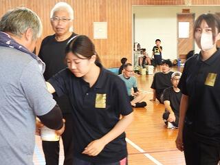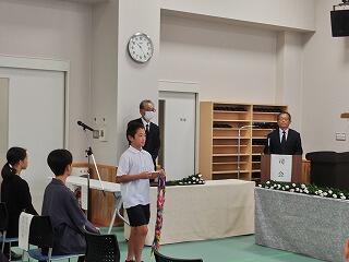 続いて、都北地区学校創意工夫工作展で賞をもらった3人の表彰です。詳しくは10月1日(火)のホームページを御覧ください。学校賞もいただきました。
