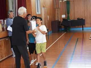 試合後の表彰式の様子です。試合に助っ人として参加していた高学年児童に賞品の受け取り役を任せたチームが多く、児童は嬉し恥ずかしという感じでした。