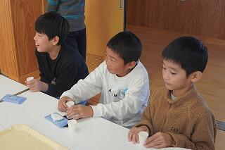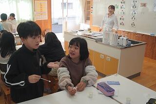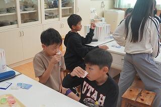 このあと子どもたちは塩や米酢、コーヒー、だし等の匂いを嗅いだり、食感を確かめたり、実際に味わったりしました。「しょっぱい」や「すっぱい」、「にがい」などと感想を言い合いながら5つの味を体感していました。