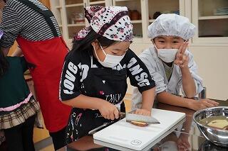 21日(木)は2年生の「おいもパーティー」がありました。自分たちが学級園で育てたサツマイモを使って「スティックさつまいも」を作りました。