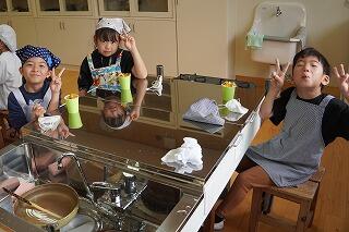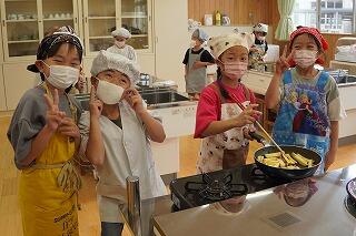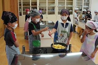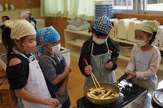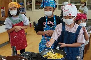 先生のサポートを受けながら、さつまいもをスティック状に切ったり、フライパンで炒めたり、砂糖を絡めたりしながら、力を合わせて上手に作ることができました。