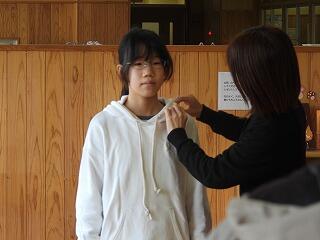 また、今回の学習と並行して、宮崎県遺族連合会から戦時の服や小物をお借りして校内で展示しました。