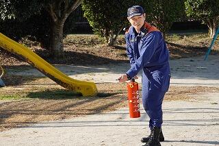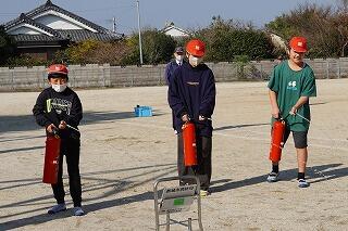 避難訓練の最後に、北消防署の方に消火器の使い方の説明をしていただき、6年生の代表児童が水消火器を使って消火訓練を行いました。
