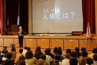 今日の全校朝会では校長先生から人権について、私たちは、だれでもみんな、一人の人間として、いのちが守られ、明るく、楽しく、しあわせに生活する権利をもっていること、イソップ童話」の『少年とかえる』の話を紹介され、“遊びのつもり”、“冗談のつもり”、“ふざけたつもり”ということが、人のからだやこころを傷つけることにつながるということ、そして、最後に、自分の今までの行動と重ねながら、「誰もが笑顔いっぱいの学校」にしていくために、どのようなことが大切なのかを考えてみてくださいとお話しをされました。