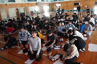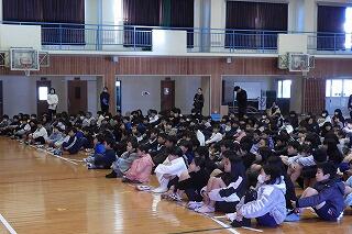 学習部の先生、生徒指導部、保健体育部の先生から、冬休み中に気を付けてほしいことについてお話がありました。子どもたちはしっかり聞いていました。
