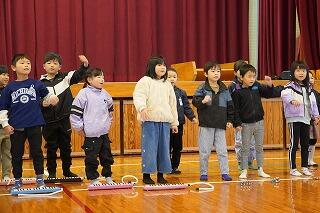 「ひなたのまんなか」では、体を動かしながら元気よく楽しんで歌いました。「いちねんせいの うた」の音読は、子どもたちは伸び伸びと体を使い、そして声に出して読んでいました。「きらきらぼし」では、楽器(鍵盤ハーモニカ、鉄琴、鈴、タンブリン、カスタネット)を、友達とリズムや速さを合わせて演奏することができました。