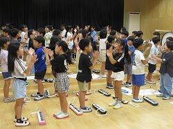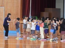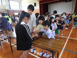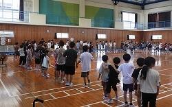 紹介後は、グループに分かれてくじを引き、くじのお題を実行するというゲームをしました。これもさまざまなお題があり、お題に出されたミッションを友達と協力しながら取り組んでいました。最後は、ジャンケン列車です。最後の勝利者が決定するまで続けられ、最後の勝利者が決定したときは、体育館いっぱいに大きな円ができあがり、友だちの輪が広がりました。