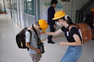 今週は、児童会が中心になって校舎内のいろいろな場所で、朝のあいさつ運動を行っています。これは、庄内地区のすべての小中学校で取り組んでいる「心のプレゼント運動」(庄内地区小中一貫教育)の取組の一つです。