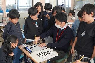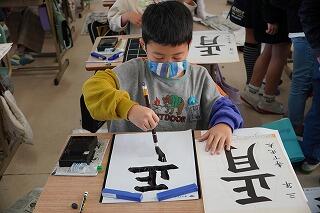3年生が書写(毛筆)の学習「書きぞめをしよう『正月』」をしていました。「おれ」「はらい」「曲がり」「反り」など、これまで学習してきたことを生かして、丁寧に書くことが目標です。