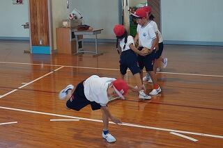 今日は、数歩の助走から両足で踏み切り、跳び箱に両手を着いてまたぎ乗ったり下りたり、足を左右に開いて手を着いて跳び越えて着地したりと、それぞれの場で一生懸命運動に取り組んでいました