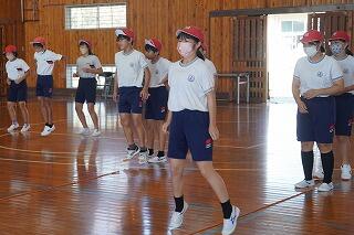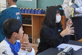 全体会では、中学校の校長先生のお話を聞いたり、全体交流を行ったりしました。その後、子どもたちは3つの班に分かれて、中学校の先生から社会科や理科、体育科の授業を受けました。
