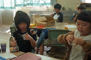 どんぐりでこまを作ったり、まつぼっくりでけん玉を作ったりして楽しんでいました。装飾にこだわる子、何度も改良を加える子、友達に作り方を教える子、作ったおもちゃで友達と競い合う子、それぞれが生活科の時間を楽しんでいました。