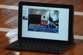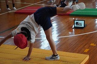 壁登り逆立ちや川跳びなど、それぞれの技能の段階に応じた練習の場が作られていました。そして、1人1台端末のカメラアプリ「タイムシフトカメラ」を活用して自分の体の動きを確認していました。このアプリは優れもので、Webカメラで撮影した画像を遅れて表示(遅延時間を設定できる)できるため、技を終えて、確認に行くと、自分の体の動きをすぐに見ることができます。撮影→再生が自動的にできるので、タイムラグなく、確認→練習→確認→練習ができます。