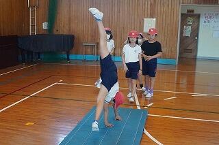 3年生は体育科の学習でマット運動を行っています。今日は、回転系の「側方倒立回転」の技に取り組んでいました。