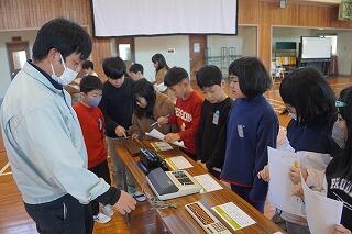 今回「生活の道具の移り変わり」の学習で、都城市文化財課の方に出前授業にきていただきました。子どもたちは、文化財課の方に古い道具の使い方について話を聞いたり、実際に道具に触ってみたりしました。