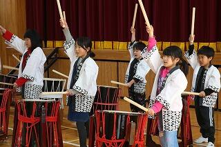 まずは、この1年間で目覚ましい上達を遂げた「西岳太鼓」の演奏です。全校児童で奏でる迫力ある音が体育館いっぱいに響き渡り、華やかな幕開けとなりました。