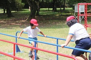 特にこの時期は暑さが厳しいため、子どもたちにはこまめな水分補給を促し、熱中症指数計を確認しながら安全に配慮して活動しています。