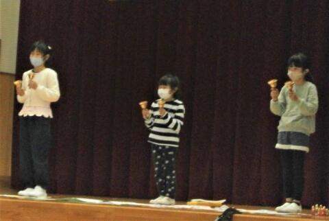 1、2年生の合奏の柚須です。音楽の時間に練習した成果を発表できました。