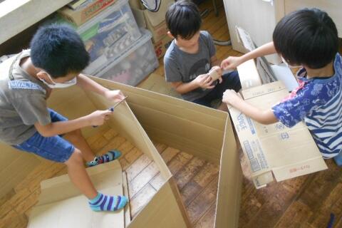 たけんこクラブで、中学生と一緒にダンボールハウスを作っています