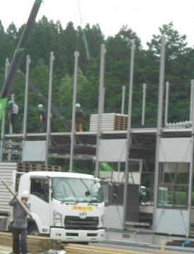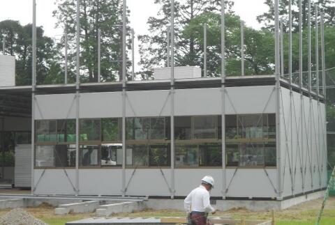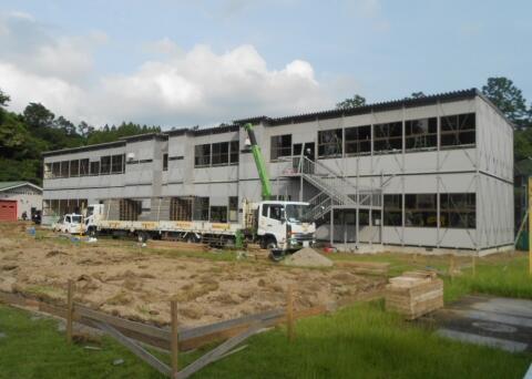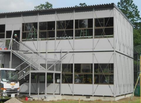 体育館の屋根上の太陽光パネルの設置工事が始まりました。