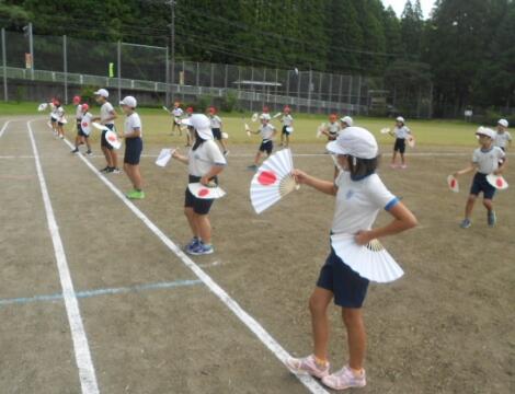 隣の人との間隔に気をつけて応援や踊りの練習をしました。