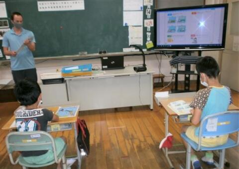 ALTの先生と一緒に、3・4年生が英語の勉強をしています。