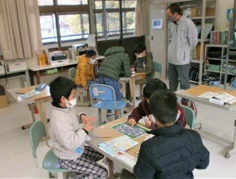 3・4年生が地図を広げ「Turn left.」「Go straight.」と