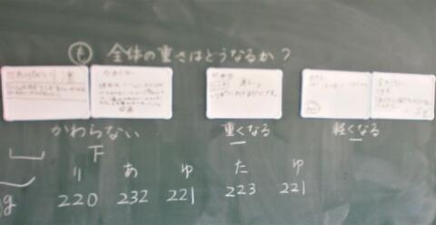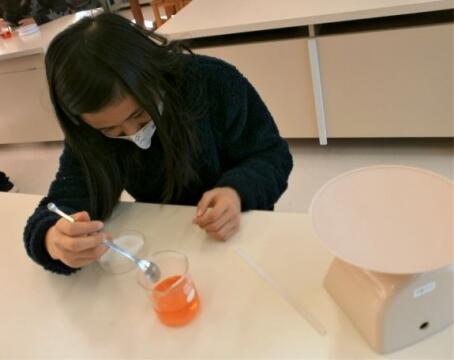 5年生が塩を水に溶かし、重さを調べる実験をしていました。