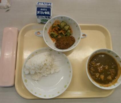 今日の給食のメニューは「カツカレーとグリーンサラダ」でした。