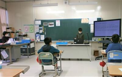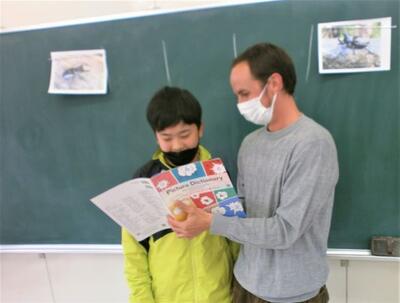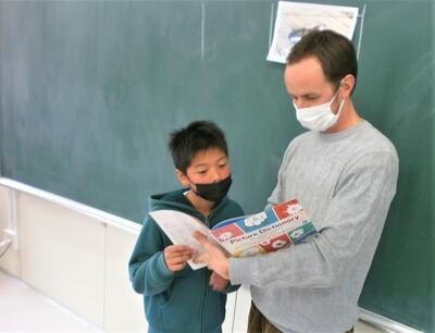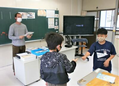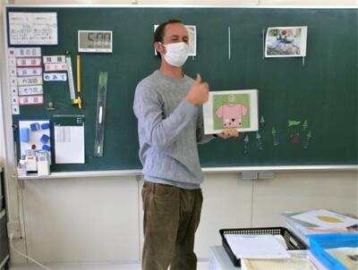ジャスティン・モリス先生と3・4年生、今年度最後の授業が教室で行われています。