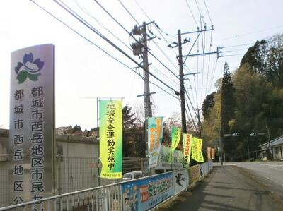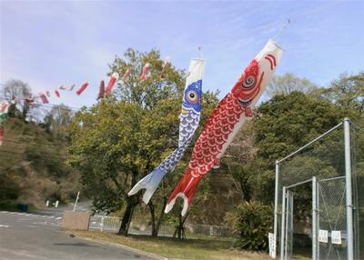 隣接する西岳公民館に鯉のぼりが飾られ、風になびいています。