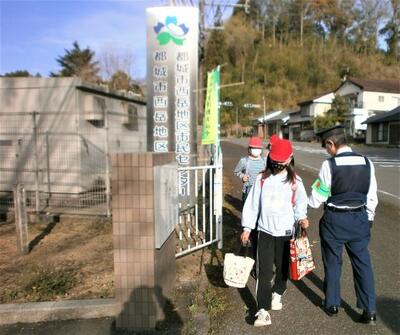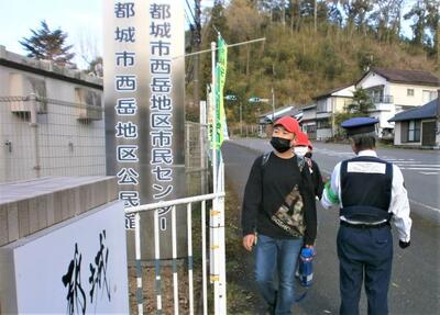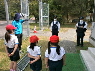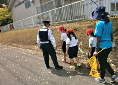 西岳駐在所の方に「道路の歩き方」と「横断歩道の渡り方」を指導していただき