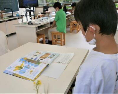 5年生が、発芽の条件を考えながら、発芽するかどうか予想していました。