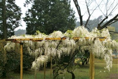 現在、藤が満開で、花が真っ白に咲き、とてもきれいです。