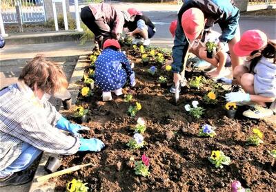 1・2・6年生が公民館の花壇にパンジーの苗を植えました。フラワーボランティアの