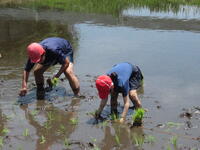 そして、いざ田んぼの中へ。初めて田んぼに入る子もいて、「足が土からぬけなくなった。」「にゅるにゅるして気持ちわるい。」となかなか足が進まない子もいました。でも、高学年のお兄さんの「ぼくが、1年生見ます。」という頼もしいサポートのもとにどんどん上達し、一人4~5カ所もすいすい植えられるようになりました。