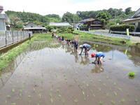 6月7日(水)全校児童で田植えを行いました。学校から徒歩15分ほどのところにある田んぼを毎年お借りして、田植えや稲刈りを体験しています。