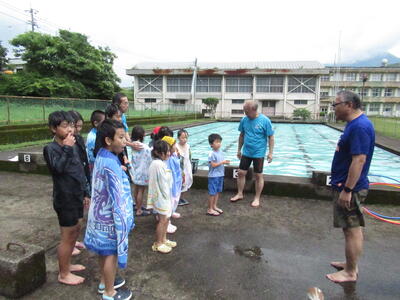曇り空の朝で心配しましたが、時折陽ざしも差す中でプールでの授業を行うことができました。1~3年生は、浅いところ使って、顔付けや電車ごっこ、石拾いなどを行いました。久しぶりの冷たい水で、なかなか入るのも難しかったのですが、だんだんと水温にも慣れ、水の感触を楽しんでいました。高学年は、水慣れのあと泳ぎ方も思い出しながら自由形を披露していました。