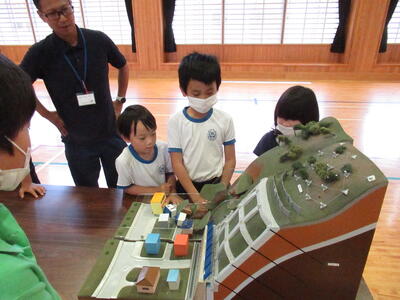 まずは、土砂災害の種類「土石流」「がけくずれ」「地滑り」は、どんなものか、実際の映像を交えて説明されました。かなり大規模な災害の現場映像でしたので、それぞれの恐ろしさが伝わってくるものでした。そして、土砂災害から身を守るためには、身近な危険箇所を知っておく、避難する場所を確認しておくなど日頃の備えが大切であることを丁寧に教えてくださいました。その後、模型を実際に扱いながら、土砂災害のメカニズムや防災の仕組みを学ぶことができました。