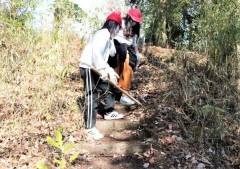 階段に積もっているたくさんの落ち葉をみんなの力で取り除いていきました。