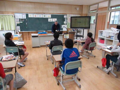 写真はアルファベットや英単語をテレビの映像を見ながら、発音したり覚えたりしている様子です。とてもテンポ良く活気ある授業をしてくださっていて、子どもたちも外国語の授業を楽しみにしています。